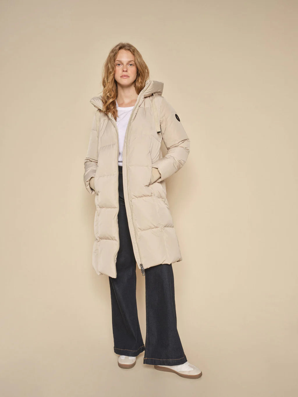Stay warm in the chilling cold with this super lightweight, yet warm down coat. It has a long fit, hood, heavy zipper, and cool check quilted pattern, filled with responsibly sourced down. High practical collar and side slits, making the fit extra flexible.