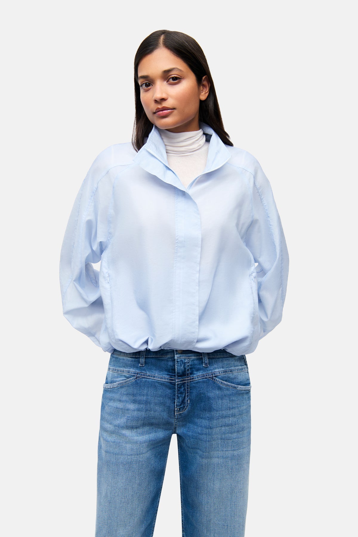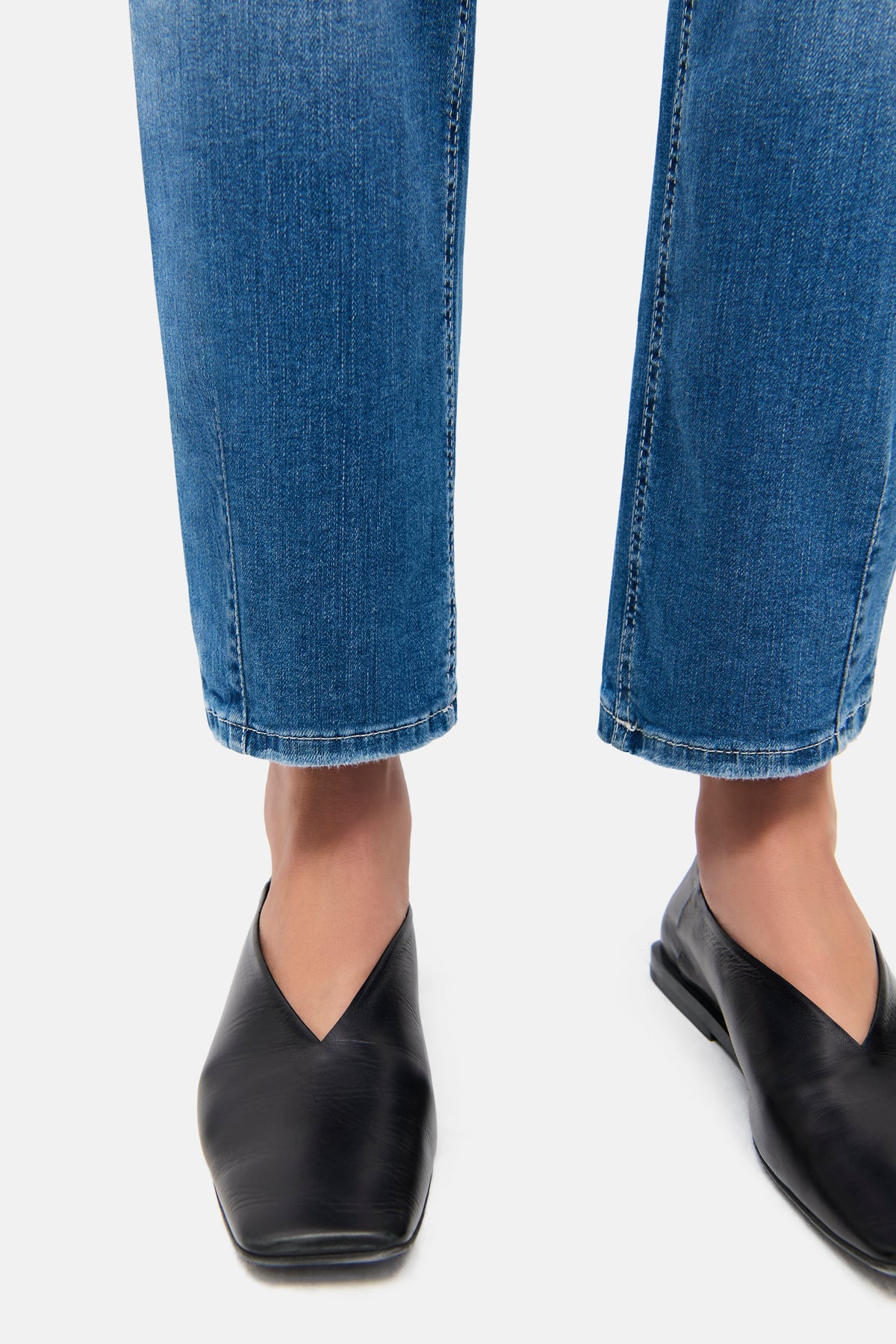 O-shape denim ELIN in a cropped length. The high-quality super-stretch denim with its authentic texture offers comfortable freedom of movement and retains its shape perfectly, even after extended wear. The modern blue wash gives the jeans a vibrant, casual look. Diagonal front pockets add subtle accents, while the voluminous curve and tapered leg create a harmonious balance between width and definition. Available in blue, dark blue, and white.