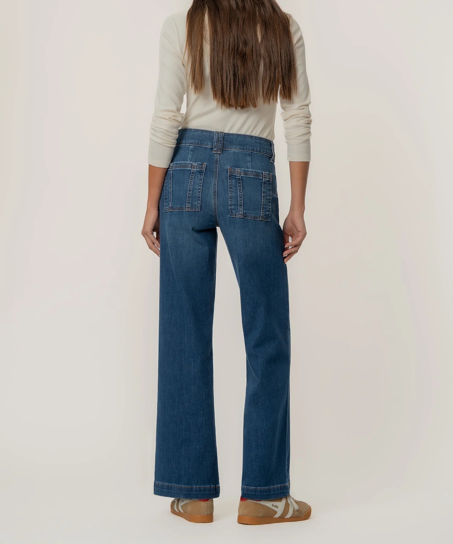 Structured meets effortless in these high rise, straight leg jeans, designed in a classic medium wash with a modern edge. Porkchop pockets and a double button closure add utility-inspired detail, while the stretchy material keeps the fit flexible and flattering from day to night.
