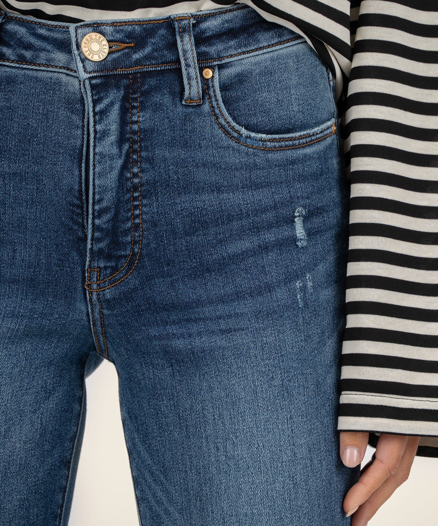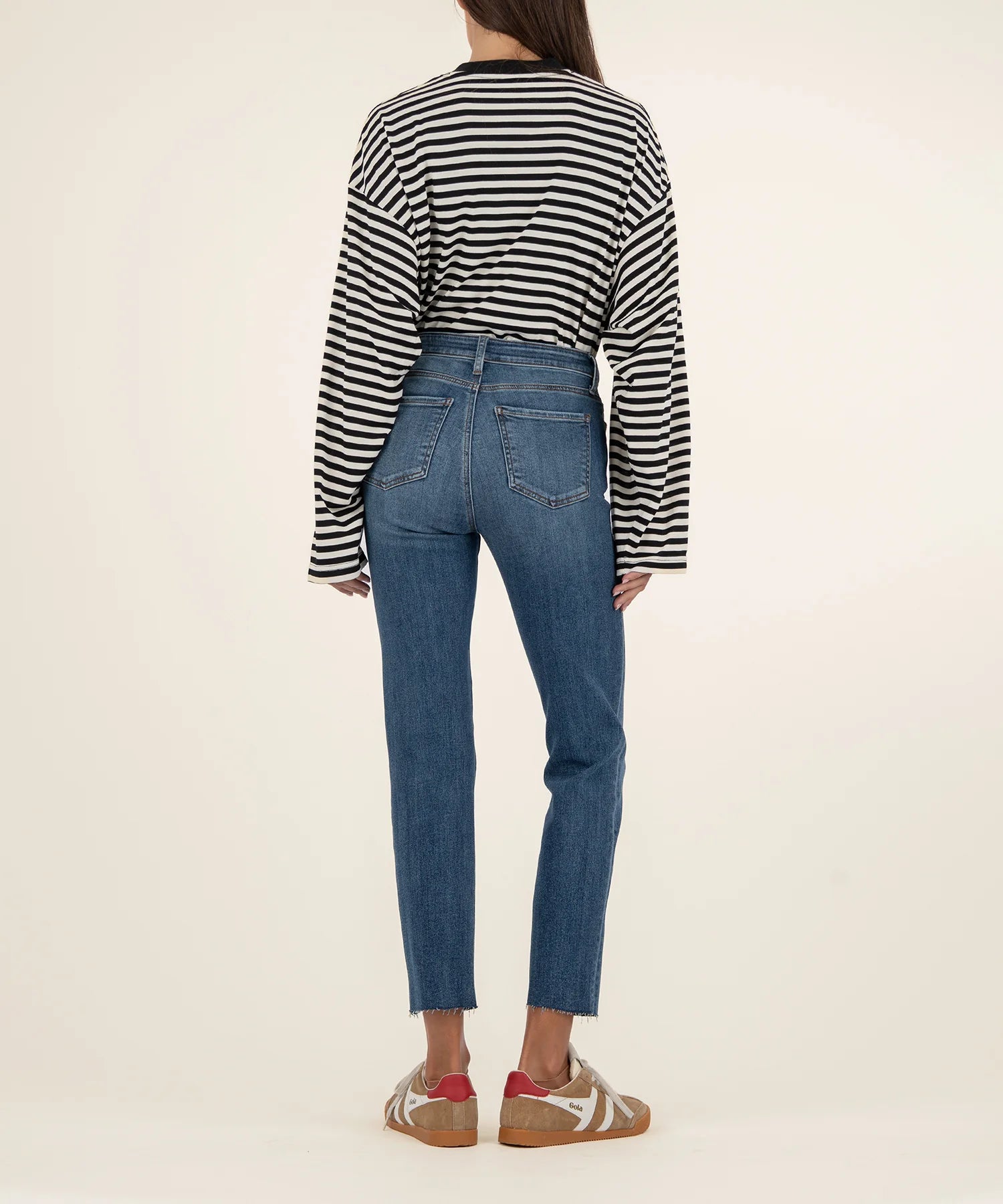 Step into effortless cool with these high-rise ankle straight jeans in a versatile medium wash. Featuring Fab Ab for a flattering fit, a trendy raw hem, and a touch of distressing, they’re made from stretchy material for comfortable all-day wear. Perfect for casual looks with an edge.