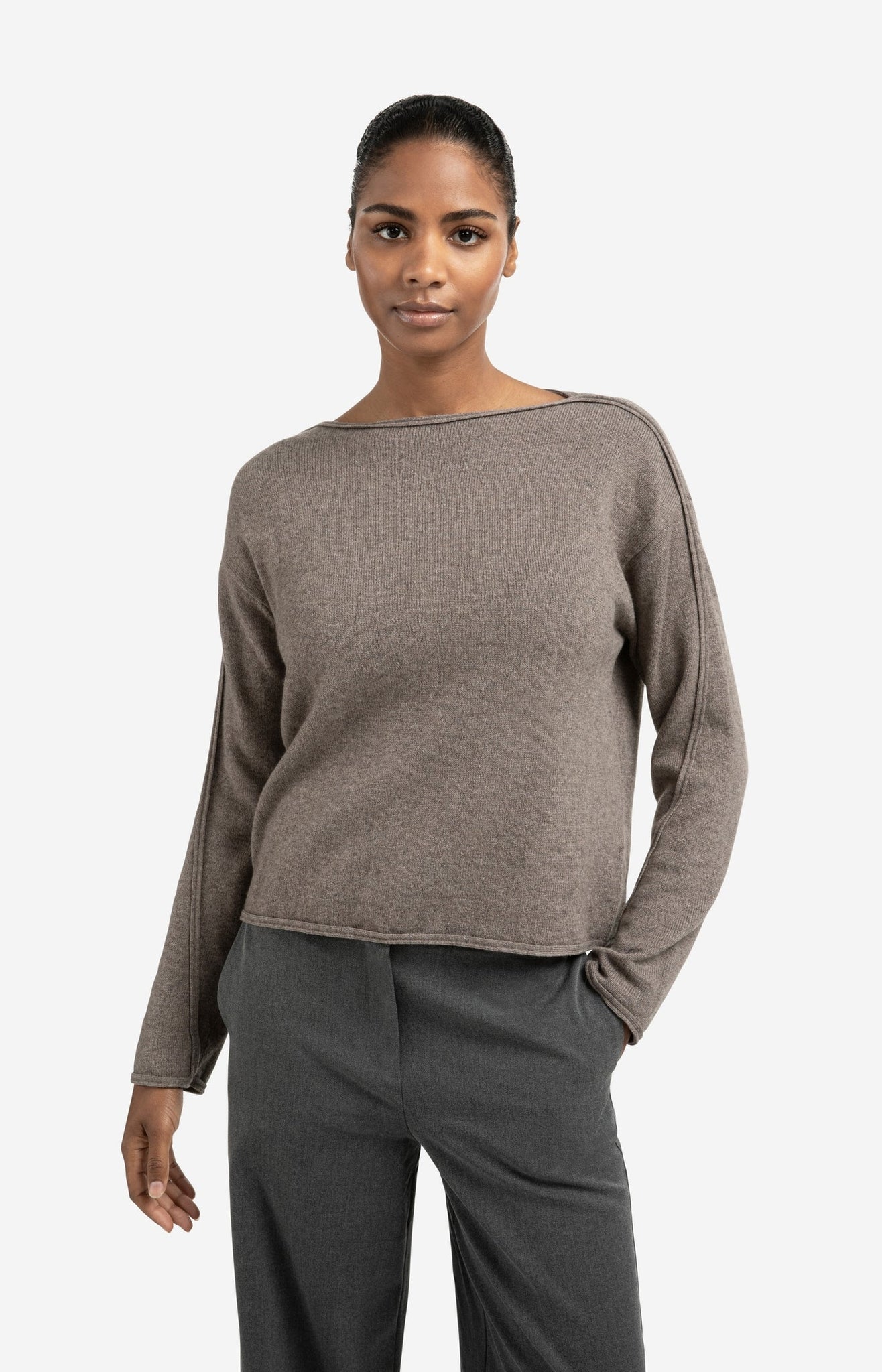 This finely knitted sweater features an elegant boat neckline, long sleeves, and a loose fit. The refined decorative seams along the sleeves add a subtle, stylish accent. Made from a soft and comfortable fabric, perfect for an elegant look. The model is 176 cm and wears size S.