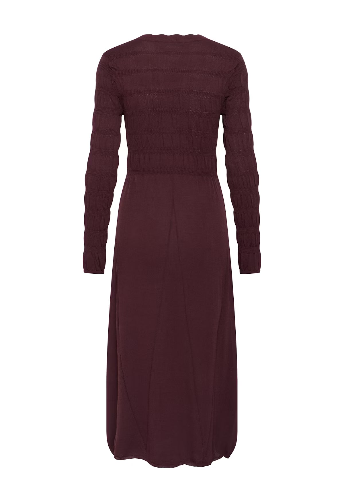 Knitted midi dress in deep burgundy with a round neckline and long sleeves. Features horizontal textured knit at the top and a fitted waist. The skirt has a voluminous shape with a balloon-style hem. The model is 172 cm tall and is wearing size S.