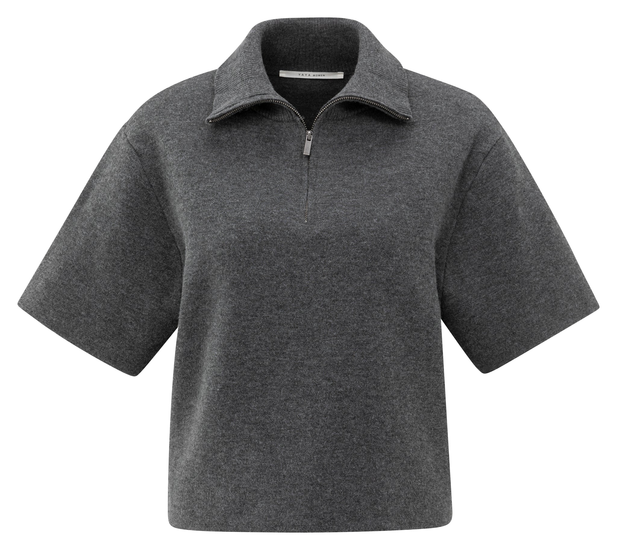 This sweater features a loose fit, short sleeves, and a ribbed high collar with a half zip closure. The sporty zip detail contrasts beautifully with the soft fabric, offering both comfort and style. A modern wardrobe essential thats perfect for casual yet polished looks. The model is 175 cm and wears size S.