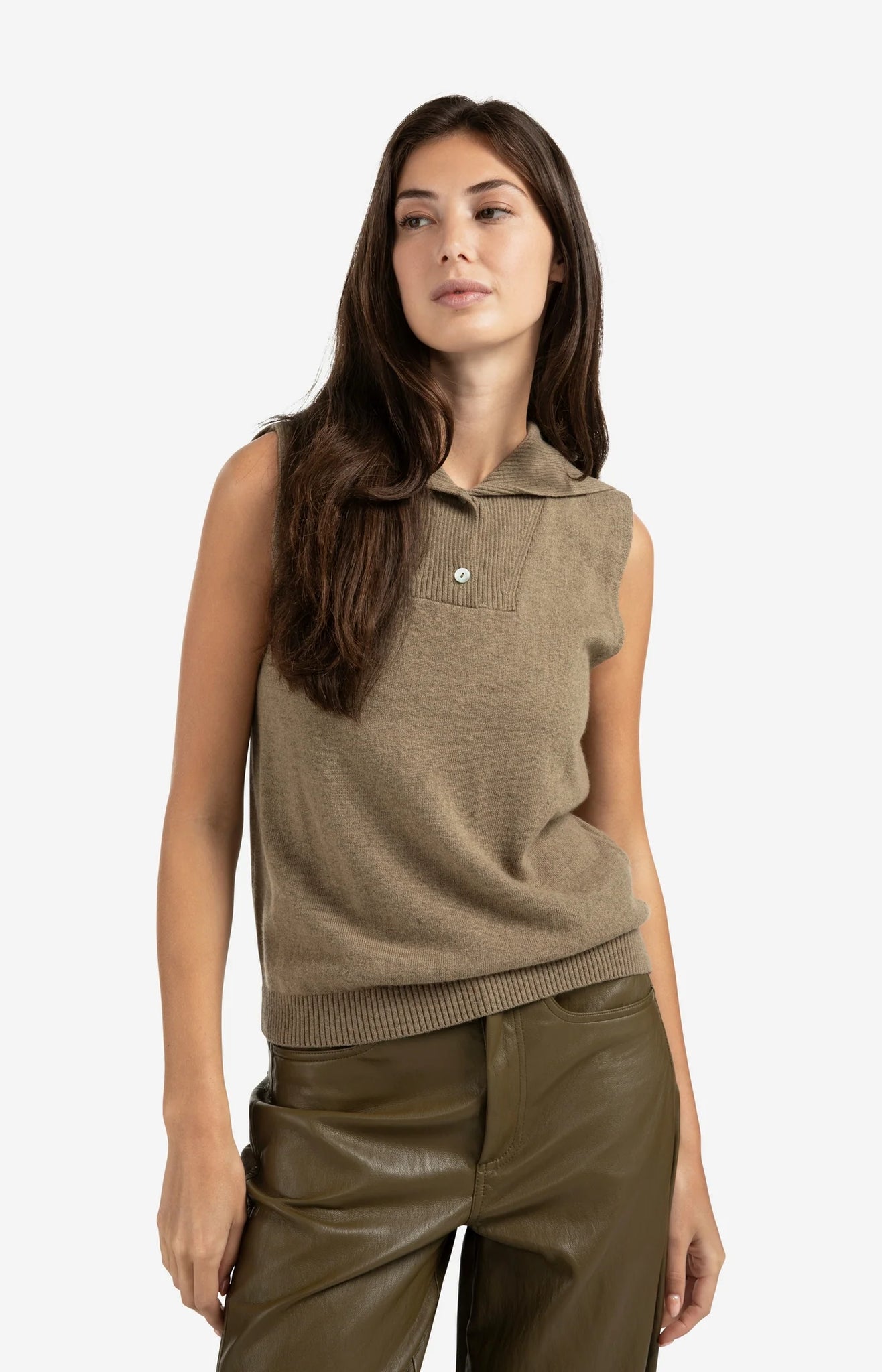 This sleeveless top is crafted from a soft fine-knit fabric and features a regular fit. Its designed with a classic ribbed collar and a button placket at the front for a refined touch. The wide ribbed hem adds a polished finish. Perfect for wearing on its own or layered over a blouse. The model is 175 cm and wears size S.