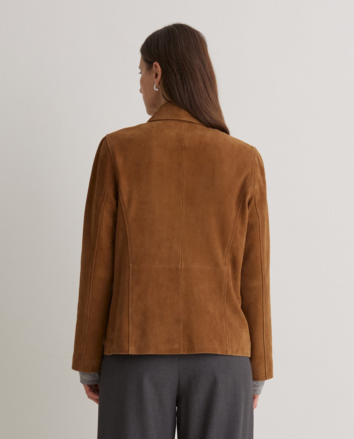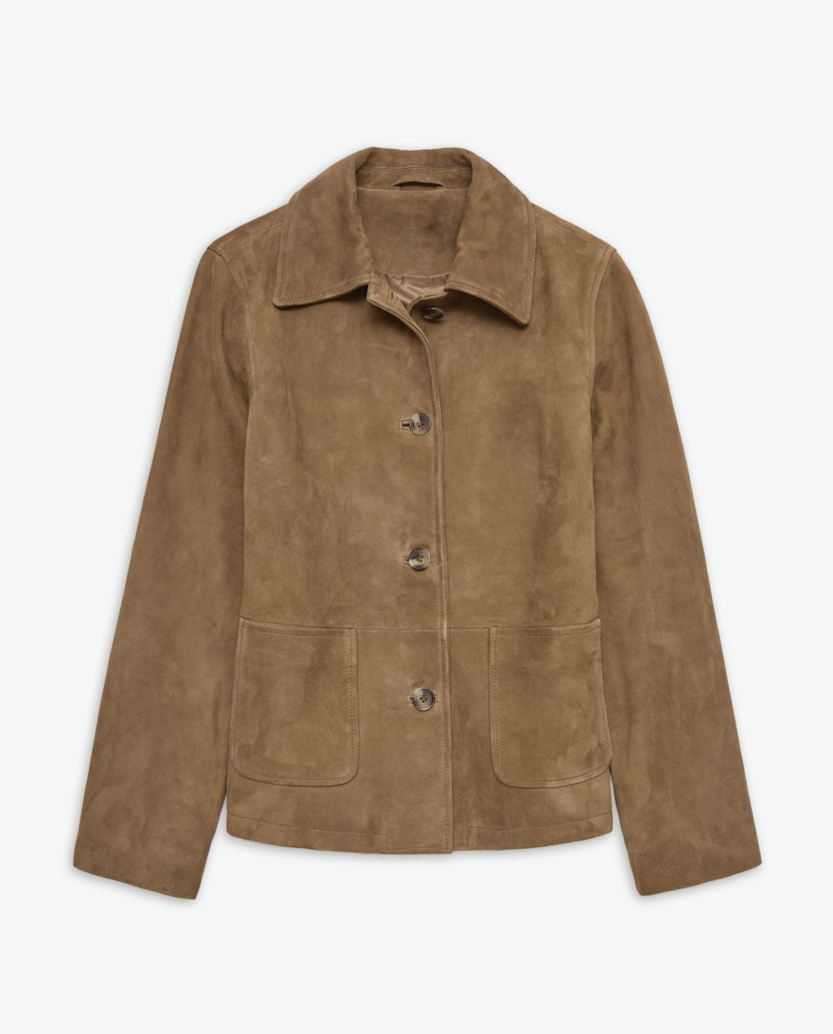 100% leather jacket. Suede finish. Collar. Long sleeves. Faux-tortoiseshell buttons. With lining. Two front patch pockets.