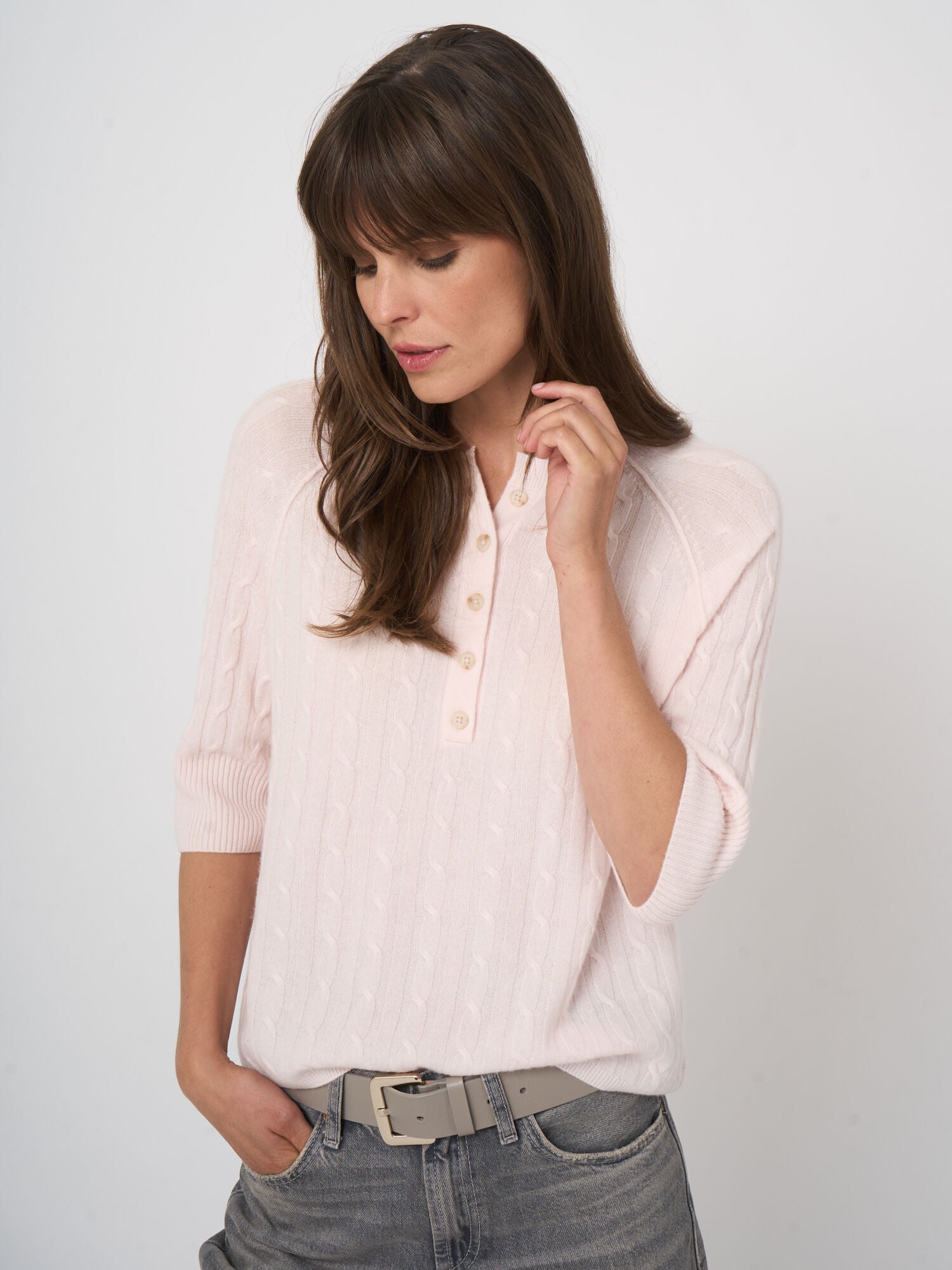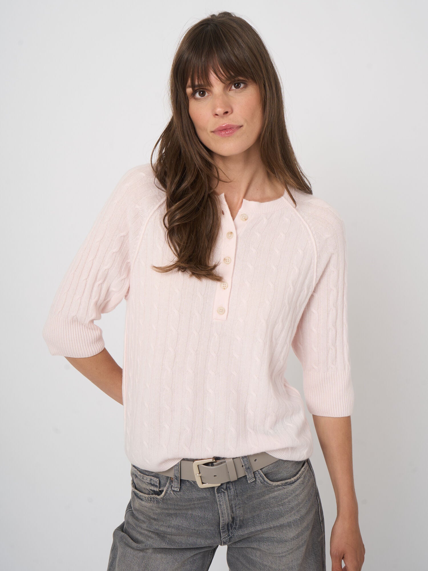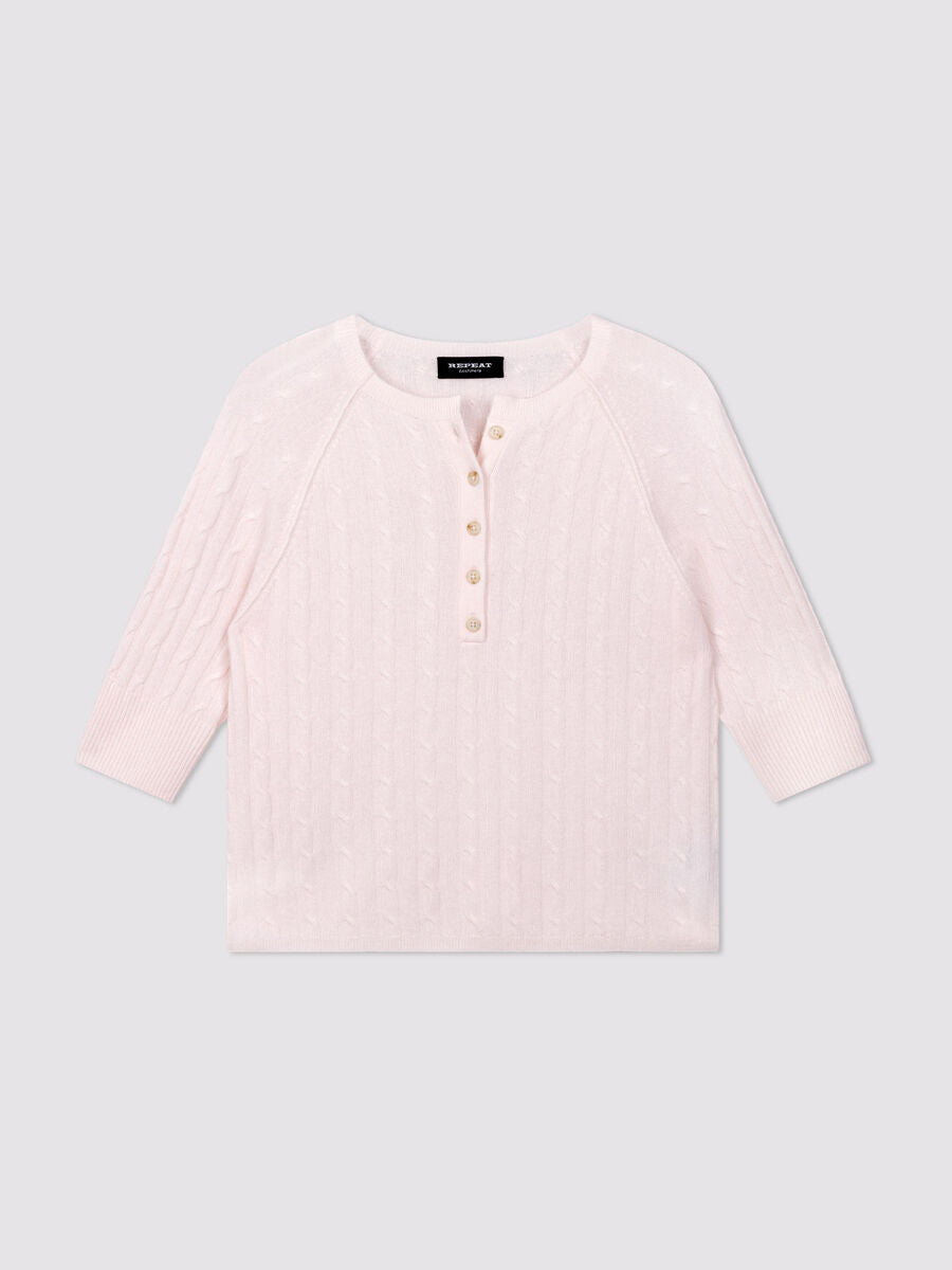 Spun from 100% GOTS-certified organic cashmere by REPEAT cashmere, the soft, lightweight fine knit showcases a delicate cable stitch with ribbed borders. A relaxed, straight-fit sweater with short raglan sleeves and decorative outside linking. Effortless for work-to-weekend, it layers neatly over tees or under tailoring.